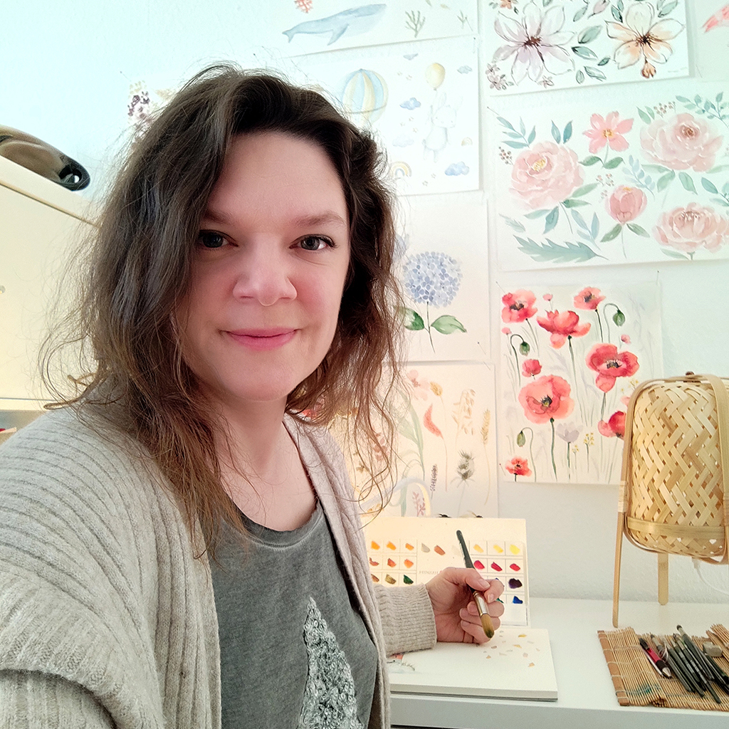 Hallo,mein Name ist Christiane Zielinski. Als Kind habe ich gerne gezeichnet und viel gemalt. Und dann, als ich erwachsen war, habe ich zuerst Grafikdesign studiert und auch noch Kunsttherapie BC (Bachelor of Arts Therapies) in den Niederlanden. Ich liebe es, Muster und Stoffe zu entwerfen. Seit 2019 entwerfe ich hauptsächlich Stoffe für Großhändler/Stofflieferanten und 2021 habe ich einen Online-Shop namens Bella Blommig gegründet, in dem ich nur meine selbst entworfenen Stoffe verkaufe, da ich es einfach liebe, den Stoff in den Händen zu halten und ich immer mehr Anfragen bekam, meine Designs auch auf Stoff zu verkaufen. Ich habe Stoffe und Mode schon immer geliebt und nähe auch gerne, aber leider fehlt mir oft die Zeit dafür. Besonders liebe ich strukturierte Stoffe wie Musselin, Rippenjersey und Waffeljersey. Ich bevorzuge es, Blumen und Tiere in Aquarellfarben zu malen. Meine Entwürfe sind stilistisch sehr flexibel, aber man kann sagen, dass ich schon immer den Bohème-Stil mochte, blumiges, verspieltes oder auch minimalistisches Design. Es kommt aber auch darauf an, welcher Stil gerade gefragt ist.